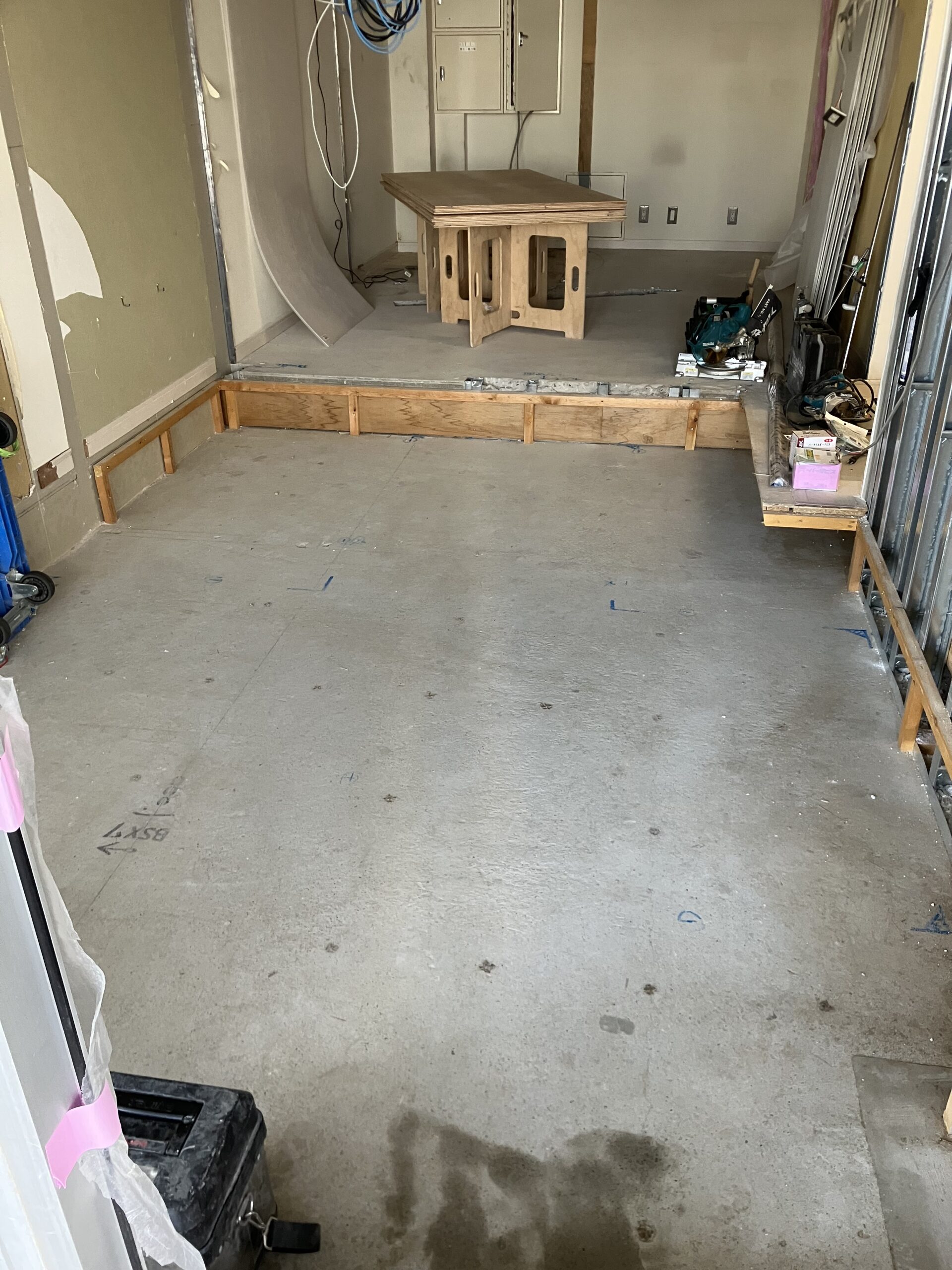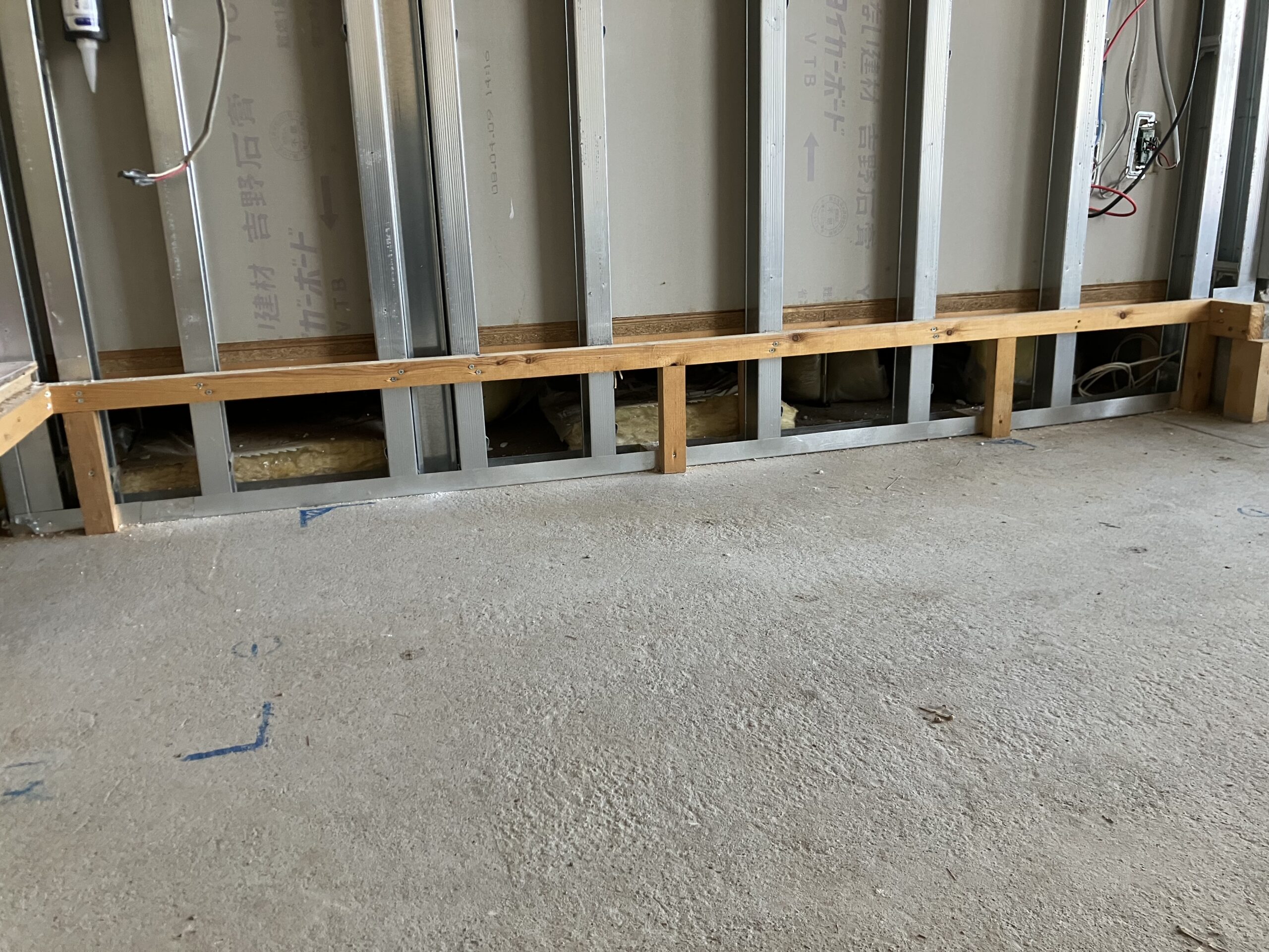 コンクリートがしっかり乾燥した後は、LGS(軽量鉄骨)による間仕切り工事が始まります。医療機器設置と並行して進められるよう、スケジュールも綿密に調整しました。