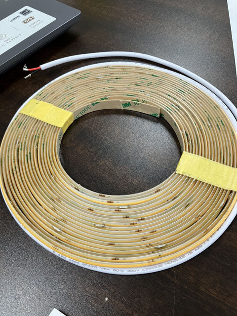 今回LEDテープライトとLEDサインは、お客様からの支給品を施工させていただきました。丁度12.5mmの段差に収まる約8mm幅のテープライトでした。