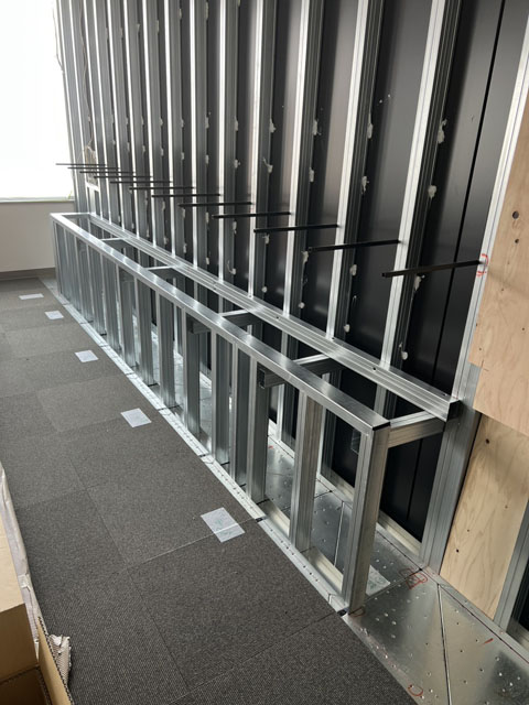 そんな場合の解決方法はいくつかあるのですが、今回は既設のスチールパーティションに対してLGS造作壁を増し張りするという工事を選択しました。