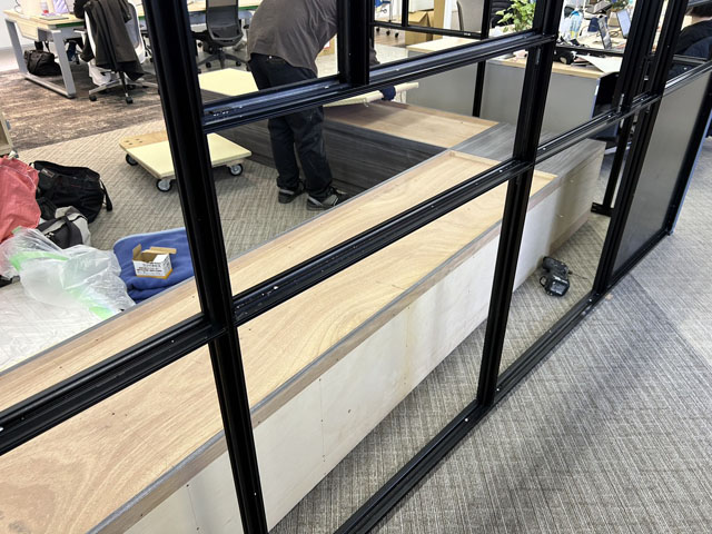 結果、今回は工場で仕上げ前までの木造作をあらかじめ作成することに。現地で組み上げ、座面部分に畳を置いていきました。
