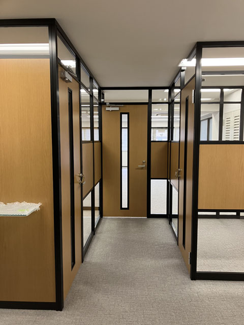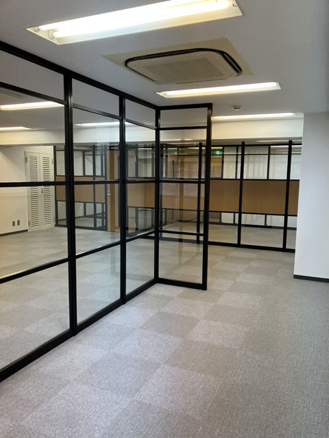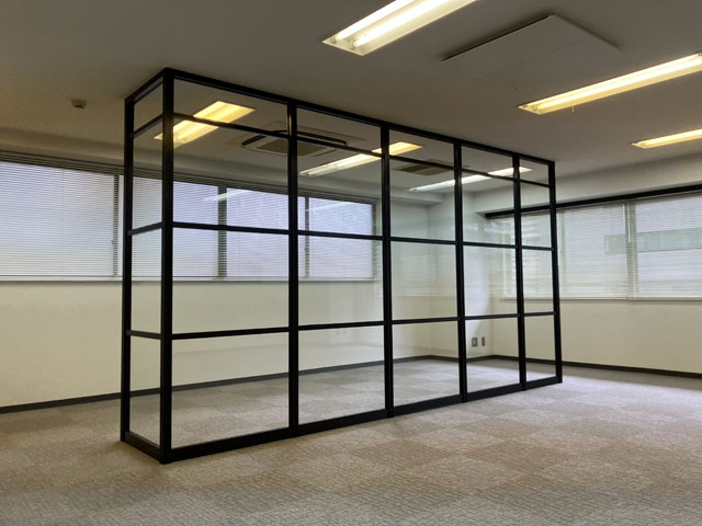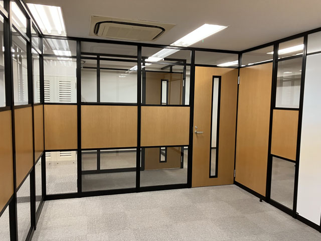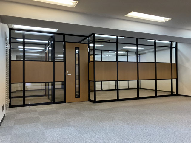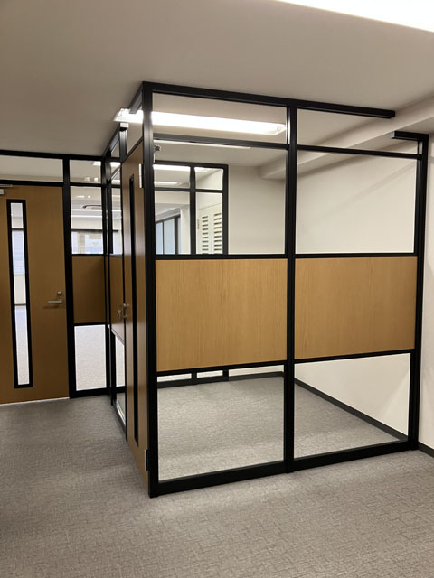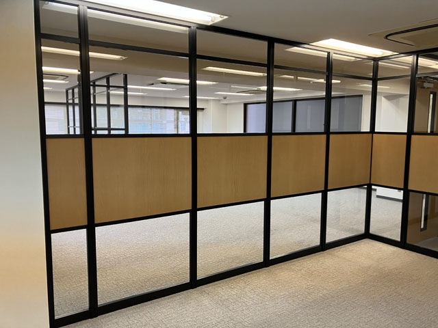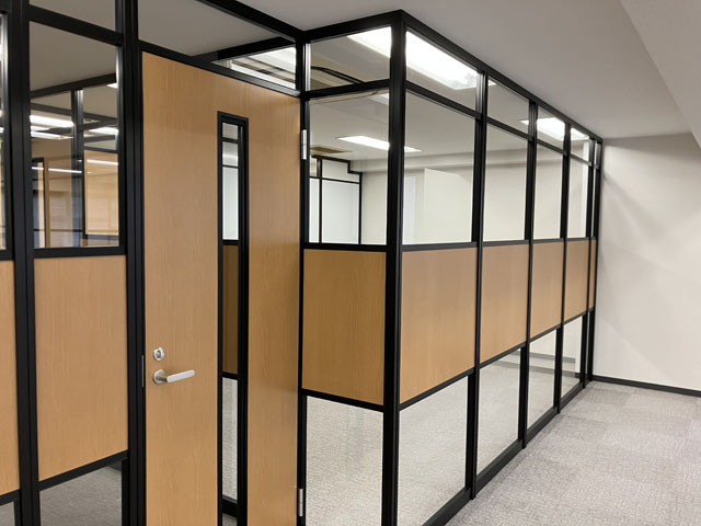 今回は、ブラックフレーム+木目+ガラスを使ってアルミパーティションを施工した事例をご紹介します。